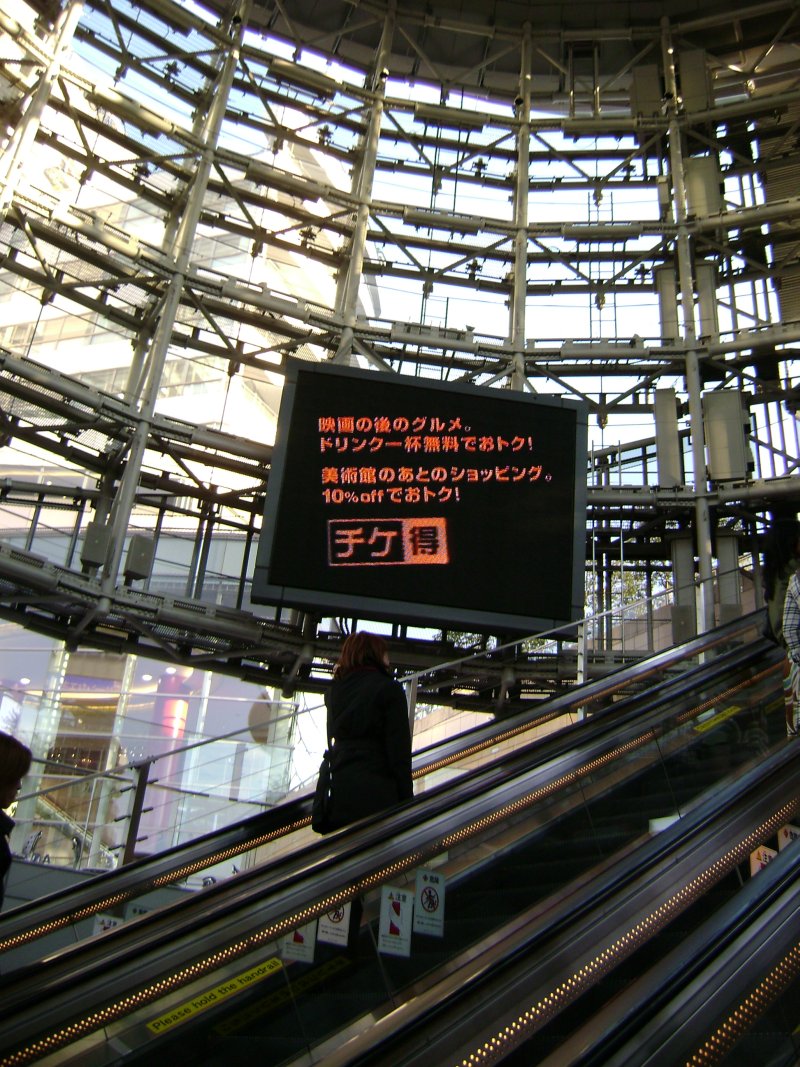Al salir de la torre hemos hecho una foto a una de las múltiples pantallas gigantes que hay por todas las zonas de rascacielos de Tokio, y curiosamente ha quedado de tal manera que parece que el texto esté sobreimpreso. En realidad el texto salía torcido en la pantalla, y hacer la foto en su misma inclinación ha sido una casualidad.