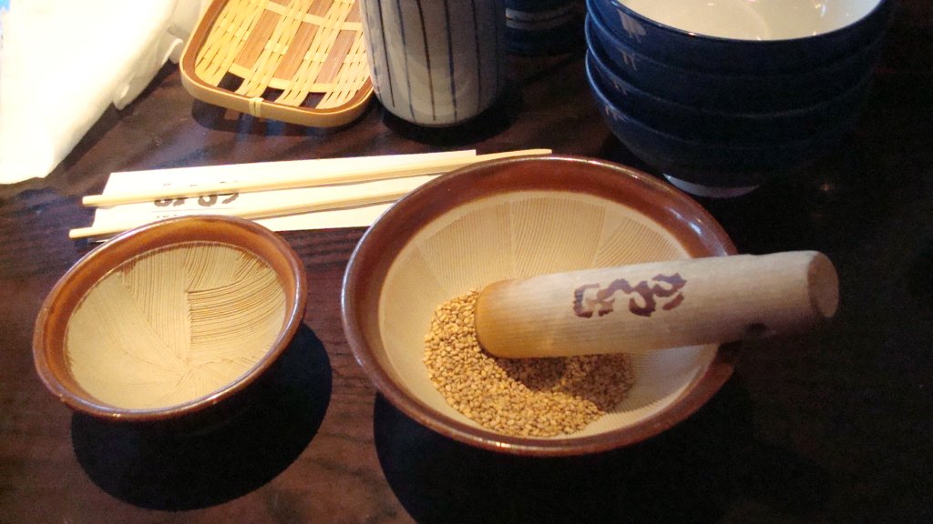 Después hemos ido a comer a un restaurante de la propia torre. Resulta que aunque parezca mentira comer en Tokio no es caro, sólo hace falta dar un par de vueltas para encontrar un restaurante en el que por 6000 yenes (unos 36€) comemos 3 personas, y hoy por esos 36€ hemos comido muy bien. Otro rato ya explicaré la comida, que nos ha gustado tanto que incluso hemos olvidado hacer alguna foto de los platos. La única, un mortero para que nosotros mismos piquemos el sésamo: