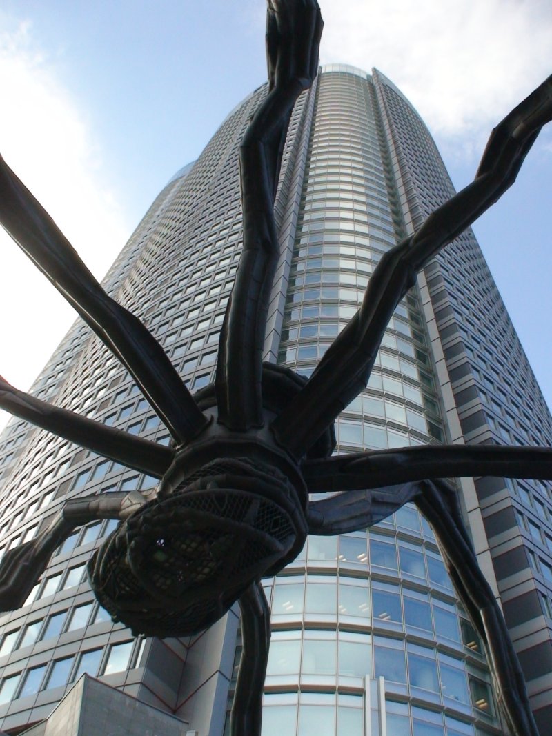 Justo en una de las entradas de la torre principal, hay una enorme escultura de una araña. La escultura tiene como 6 o 7 metros de altura en la parte más alta. En la siguiente foto se ve la araña desde abajo y la torre principal detrás.
