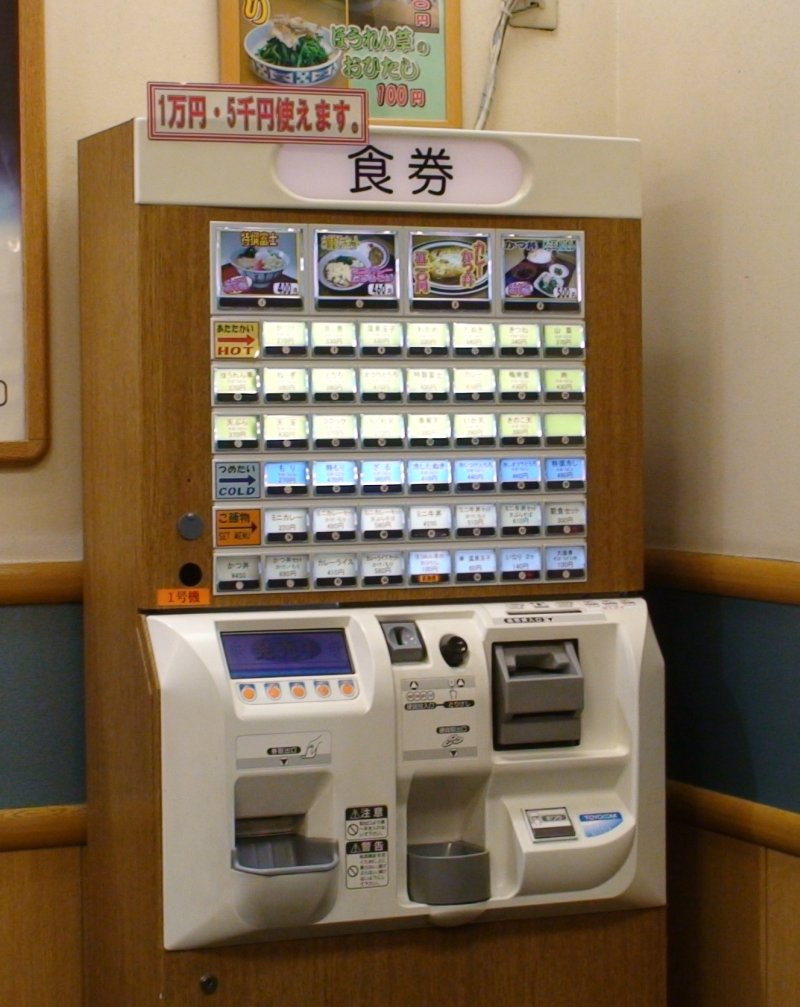 Pones el dinero (billetes o monedas) en la máquina, y aprietas el botón del plato o menú que quieres: